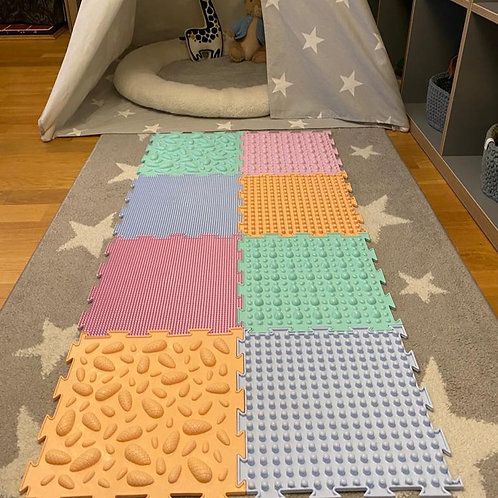 - Experimentiere mit verschiedenen Texturen mit Happy Feet Spielmatten! Kinder lieben es, neue Texturen und Empfindungen zu entdecken, und sie entwickeln gleichzeitig ihre Feinmotorik!